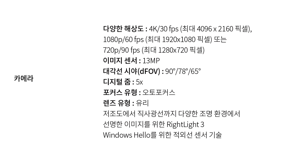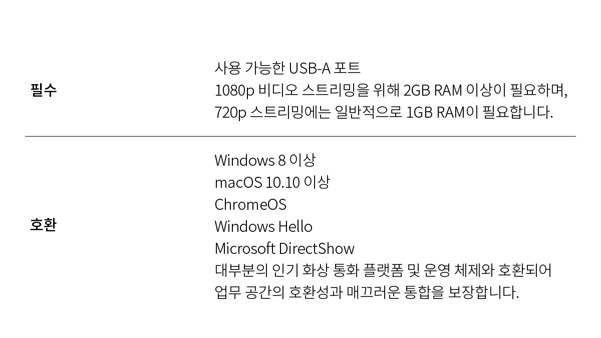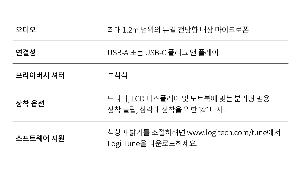 | 구성 | 웹캠, 탈착식 장착 클립, 프라이버시 셔터, USB-A to USB-C 케이블, 사용 설명서 |