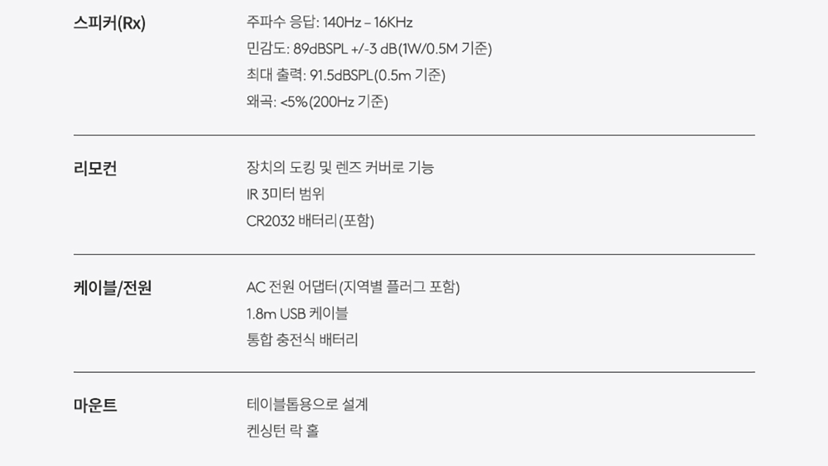 | 구성 | 본체, 리모컨, 1.8미터 USB 케이블, 전원 어댑터(지역별 플러그 포함), 설명서 |