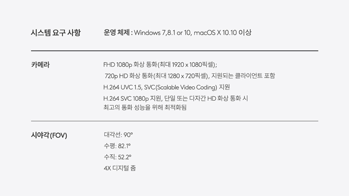 UVC(USB video device class) 지원으로 별도의 드라이버 설치 없이 USB 케이블 연결 만으로 바로 화상회의를 시작할 수 있어,