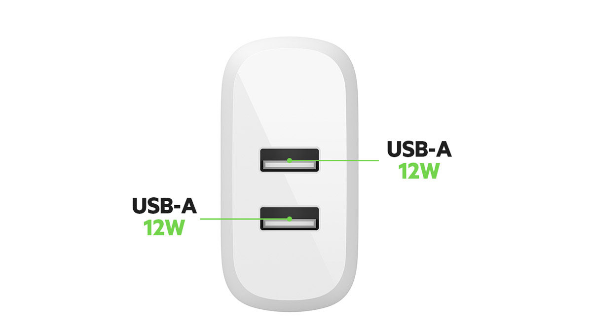 USB-A 케이블을 사용하는 모든 장치와 호환이 가능한 듀얼 포트 가정용 충전기입니다.