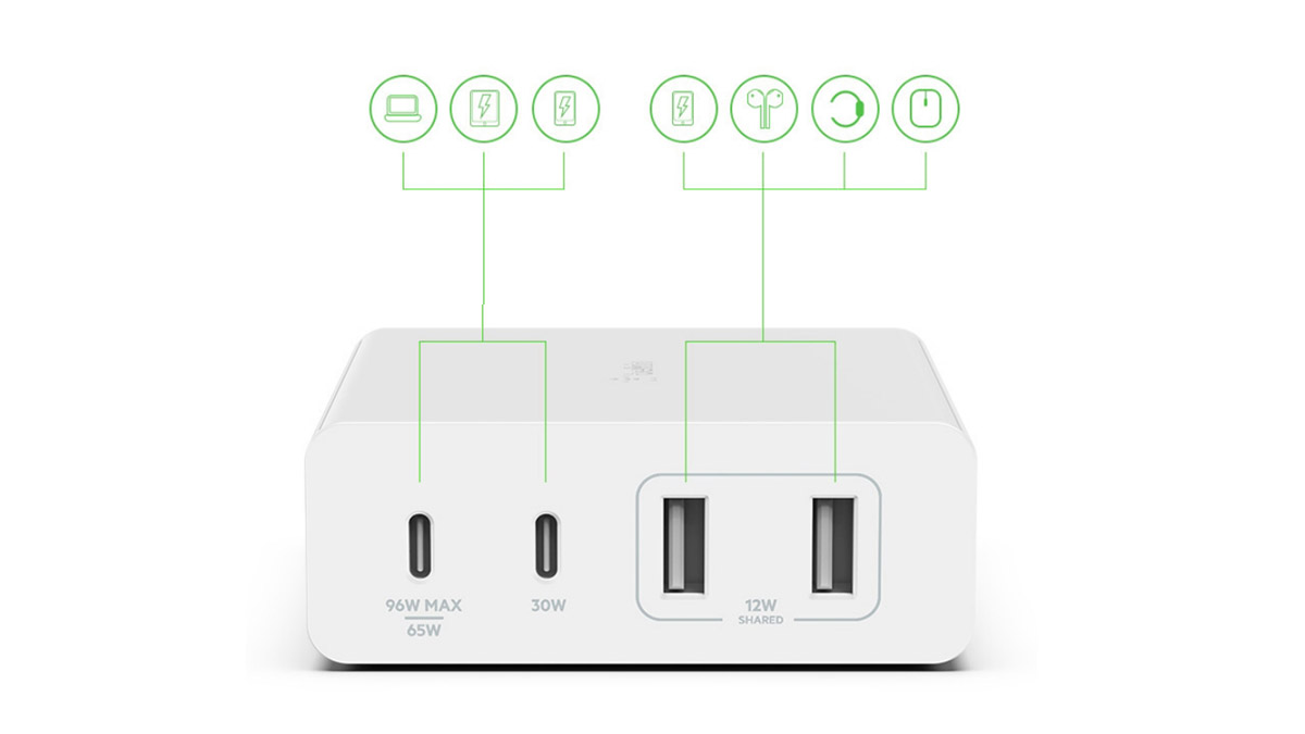 USB-C 포트 2개와 USB-A 포트 2개로 구성되어 노트북, 태블릿, 스마트폰은 물론 그 외 디바이스를 한 번에 충전할 수 있습니다.