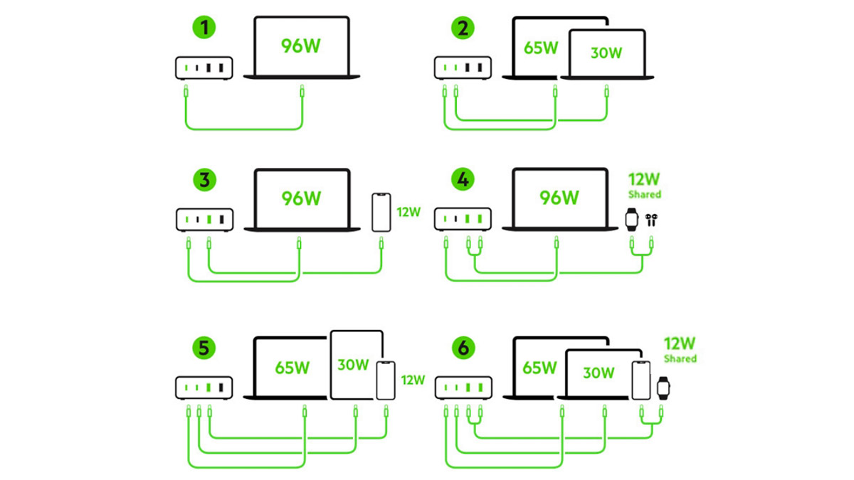 4개의 포트를 모두 동시에 사용하는 경우, USB-C 포트는 각각 최대 65W 및 30W 출력을 제공하여