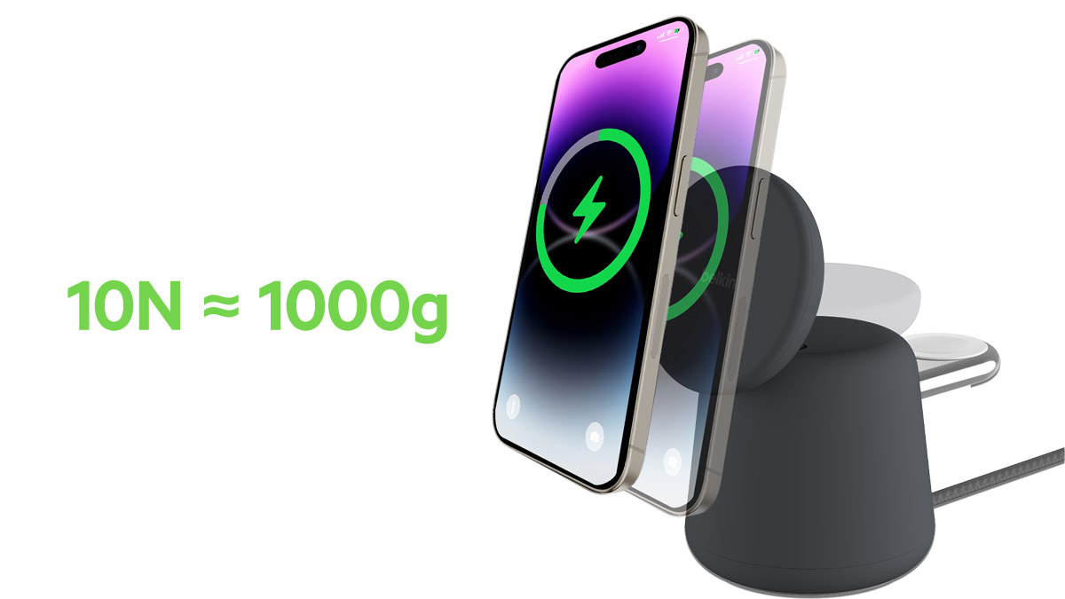 10N의 견고한 힘으로 스마트폰이 부착되어 떨어지지 않으며, 케이스를 장착한 상태에서도 iPhone을 거치할 수 있습니다.
