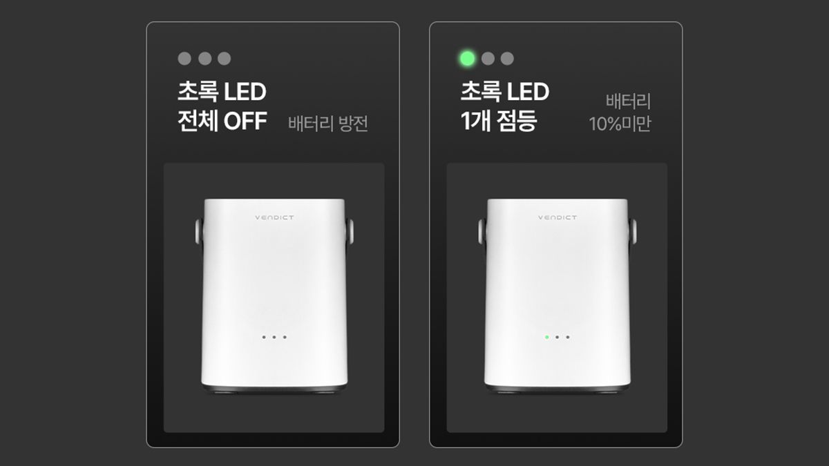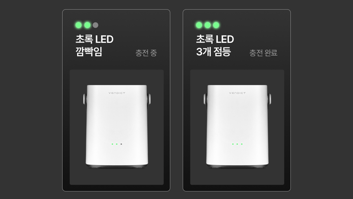 ※ 초록 LED 1개 점등 시, 배터리가 방전될 수 있으므로 미리 충전해 주세요.