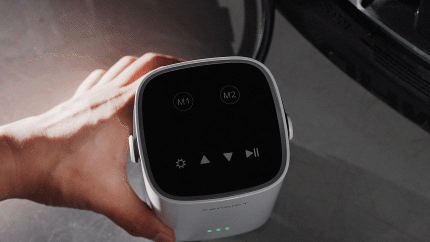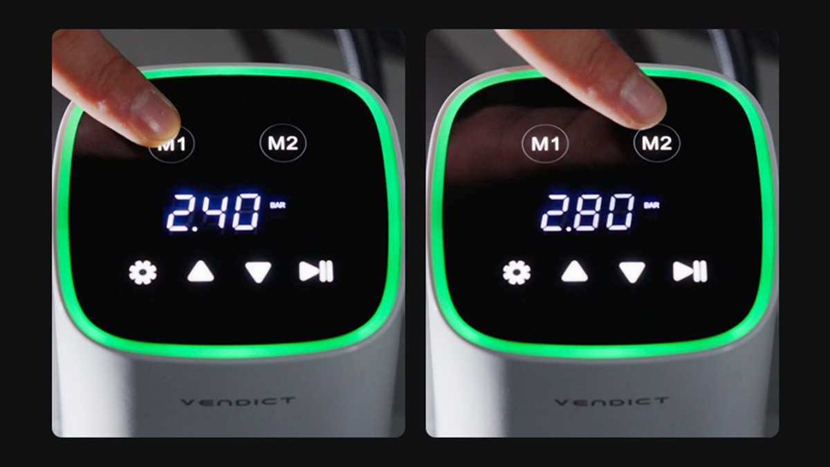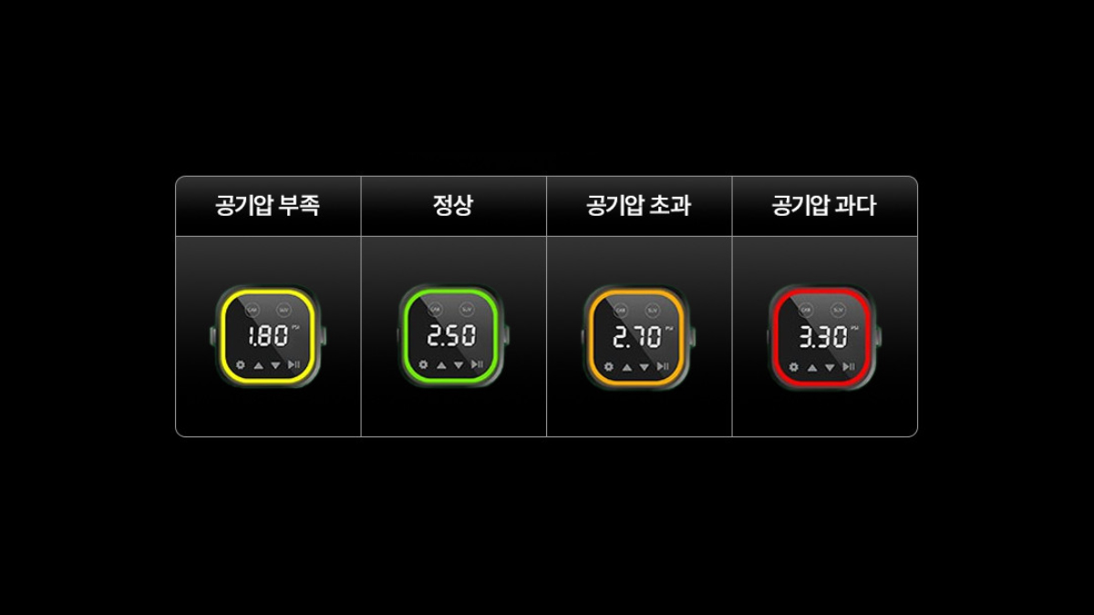 실시간으로 공기압을 확인해 정밀하게 주입할 수 있으며, 완충 상태는 직관적인 LED로 쉽게 확인이 가능합니다.