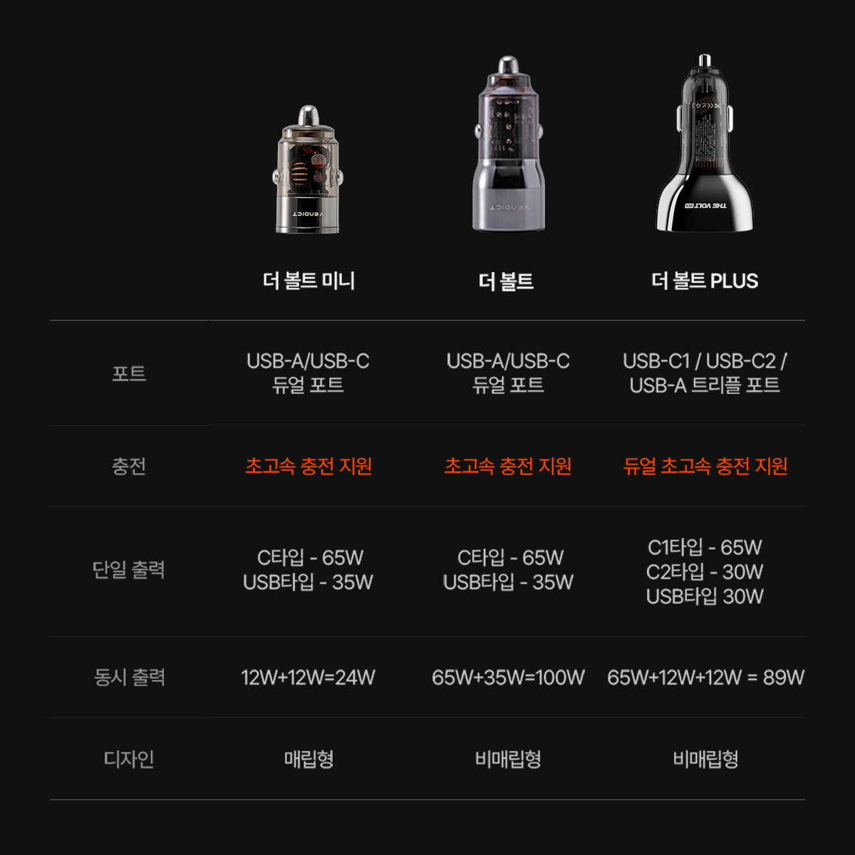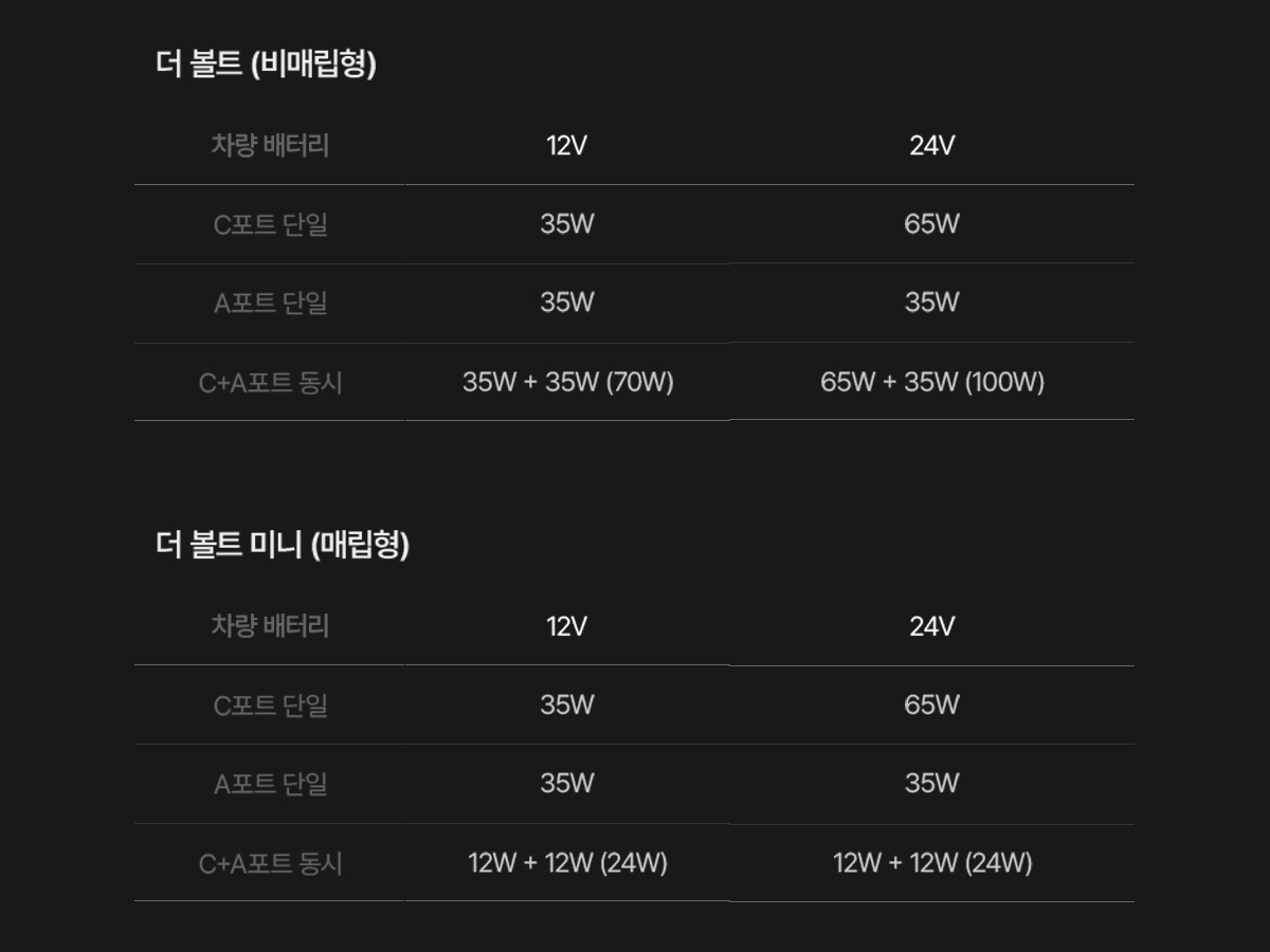- 더 볼트 [비매립형, 2포트] : 65W(C타입) / 35W(USB-A) - 동시 출력 최대 100W