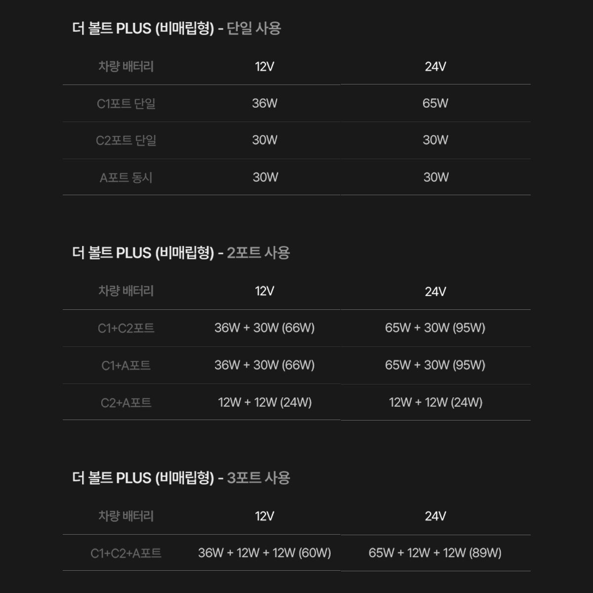 - 더 볼트 PLUS [비매립형, 3포트] : 65W(C1타입) / 30W(C2타입) / 30W(USB-A)