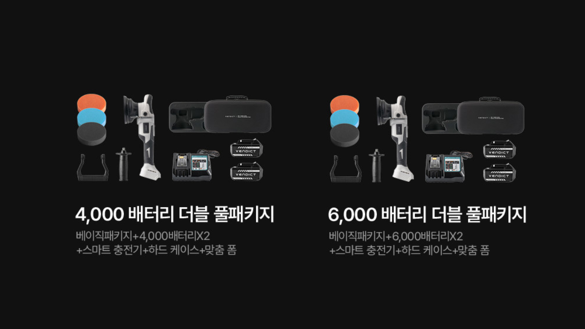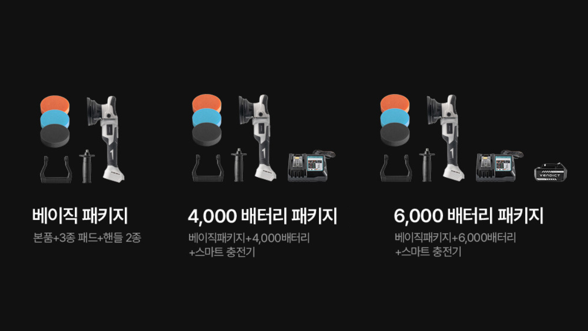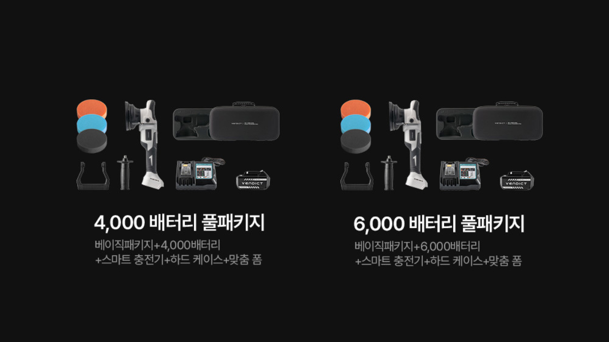 | 구성 | 베이직 라인 1. 베이직 패키지 : 본품, 3종 패드, 핸들 2종 2. 4,000 배터리 패키지 : 본품, 3종 패드, 핸들 2종, 4,000 배터리 1개, 스마트 충전기 3. 6,000 배터리 패키지 : 본품, 3종 패드, 핸들 2종, 6,000 배터리 1개, 스마트 충전기 풀 라인 1. 4,000 배터리 풀패키지 : 본품, 3종 패드, 핸들 2종, 4,000 배터리 1개, 스마트 충전기, 하드 케이스, 맞춤 폼 2. 6,000 배터리 풀패키지 : 본품, 3종 패드, 핸들 2종, 6,000 배터리 1개, 스마트 충전기, 하드 케이스, 맞춤 폼 3. 4,000 배터리 더블 풀패키지 : 본품, 3종 패드, 핸들 2종, 4,000 배터리 2개, 스마트 충전기, 하드 케이스, 맞춤 폼 4. 6,000 배터리 더블 풀패키지 : 본품, 3종 패드, 핸들 2종, 6,000 배터리 2개, 스마트 충전기, 하드 케이스, 맞춤 폼 |