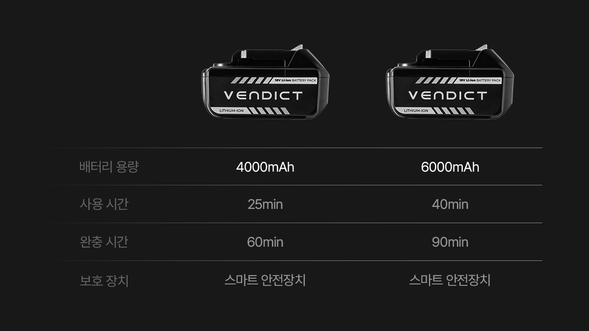 안전 설계가 된 4,000mAh와 6,000mAh 두 가지 용량 옵션으로 사용 환경에 맞게 선택할 수 있습니다.
