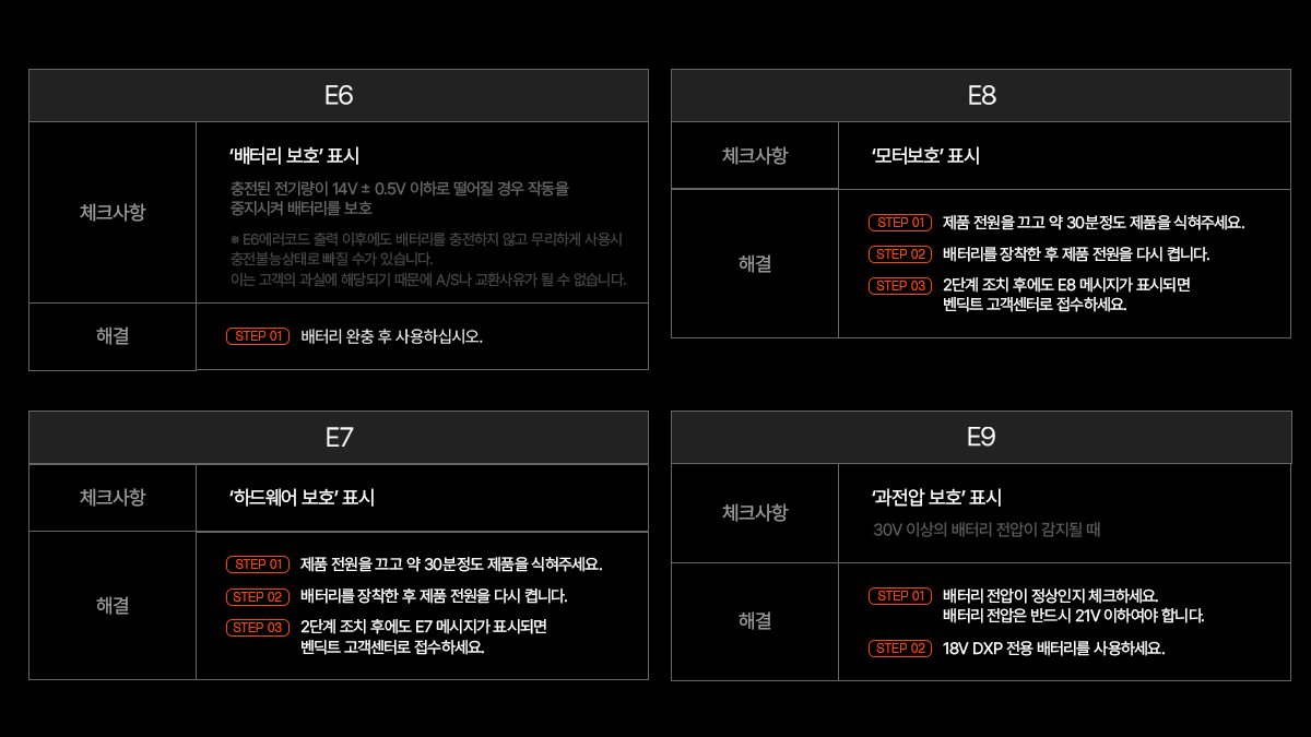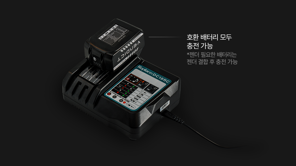 ※ 디월트·보쉬·밀워키 배터리 사용 시에는 전용 젠더가 필요하며, 10C 이상의 고성능 배터리 사용을 권장합니다.