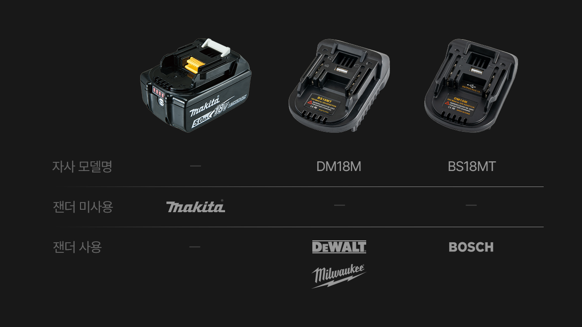 마키타 배터리와 동일한 규격을 적용해 즉시 사용 가능하며, 디월트·보쉬·밀워키 배터리도 전용 젠더를 통해 호환성을 넓혔습니다.