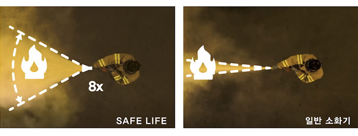 일반 소화기 대비 8배 넓은 분사 각도를 가지고 있습니다.