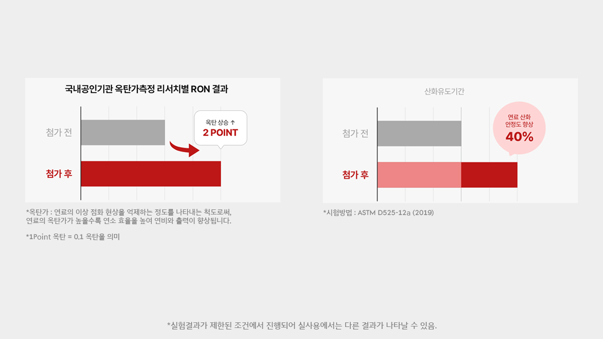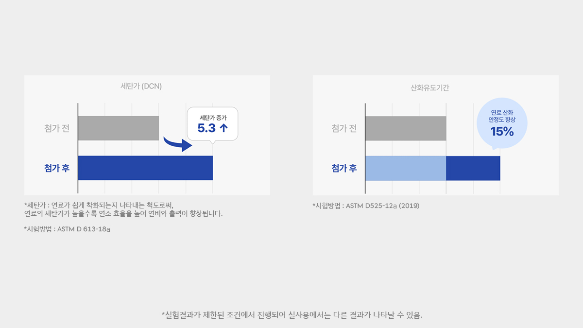 경유의 세탄가를 높여 연소를 안정화하고 시동성을 개선해 출력 향상에 도움을 줍니다.