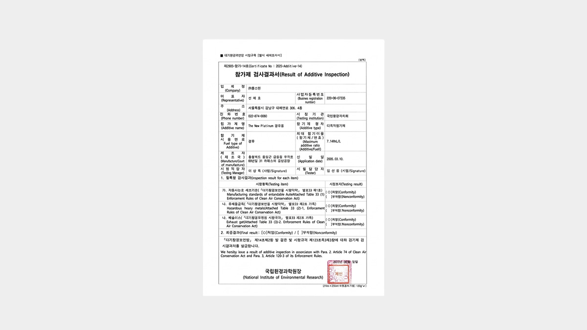 검사합격증 번호(대기환경보전법에 따른 첨가제·촉매제에 한함) 휘발유 - 국립환경과학원장 제2024-첨가-41호, 국립환경과학원장 제2022-첨가 01호