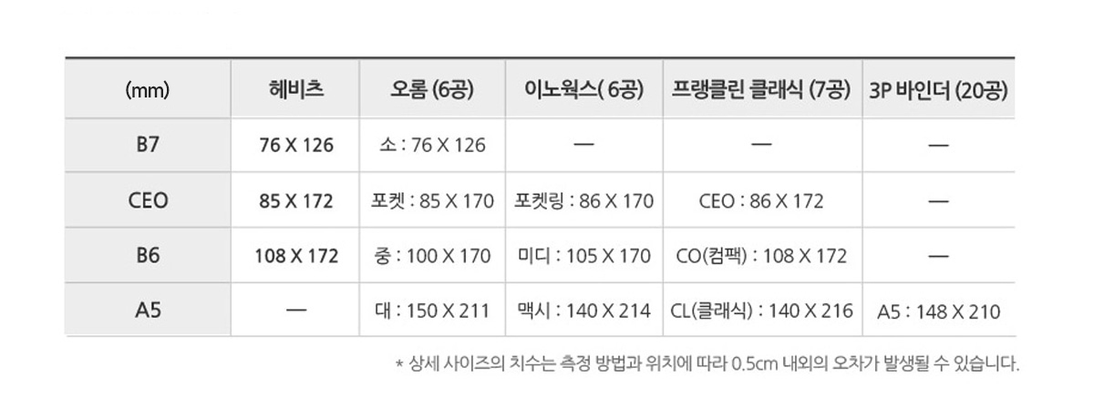 | 사이즈 | 9060(B6) : 108mm x 172mm 9061(CEO) : 86mm x 172mm 9062(B7) : 75mm x 125mm |