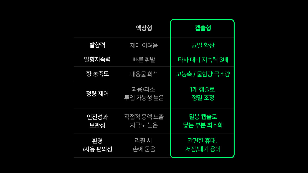 짧게 사라지던 기존 액상 방향제의 한계를 넘어 향의 깊이와 지속성을 동시에 잡아냈습니다.