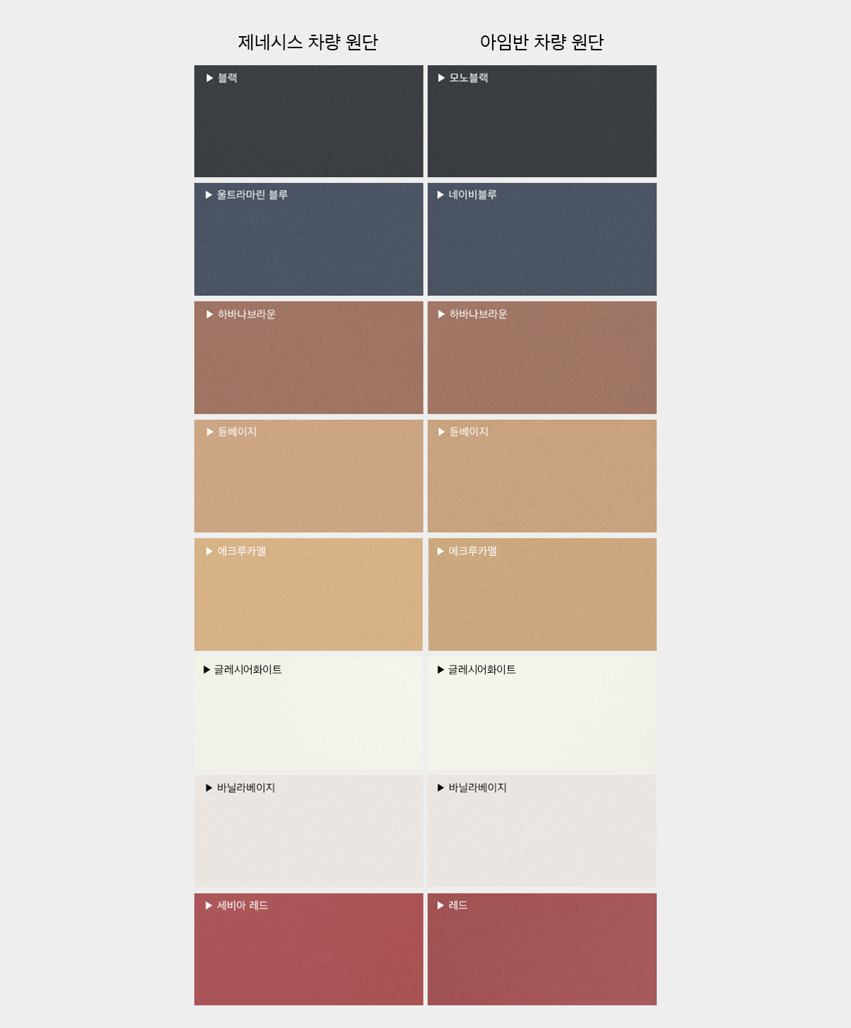 ※ 해당 색상은 실제 차량 내장재와 유사한 톤으로 제작되어 약간의 색감 차이가 있을 수 있습니다.